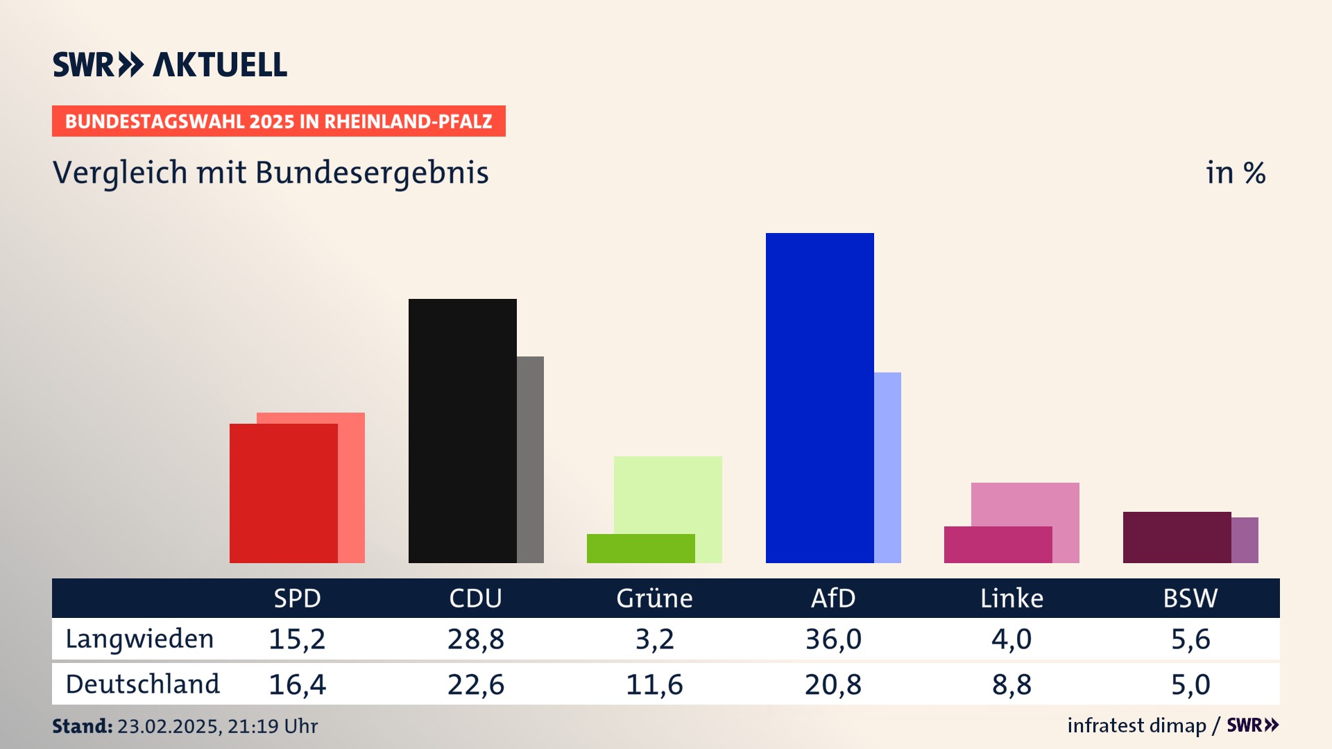 Bundestagswahl 2025 Endergebnis Zweitstimme für Langwieden. In Langwieden erzielt die SPD 15,2 Prozent der gültigen  Stimmen. Die CDU landet bei 28,8 Prozent. Die Grünen erreichen 3,2 Prozent. Die AfD kommt auf 36,0 Prozent. Die Linke landet bei 4,0 Prozent. Die Freien Wähler erreichen 3,2 Prozent. Die Tierschutzpartei kommt auf 2,4 Prozent. Die 2021 nicht angetretene Partei BSW bekommt 5,6 Prozent.