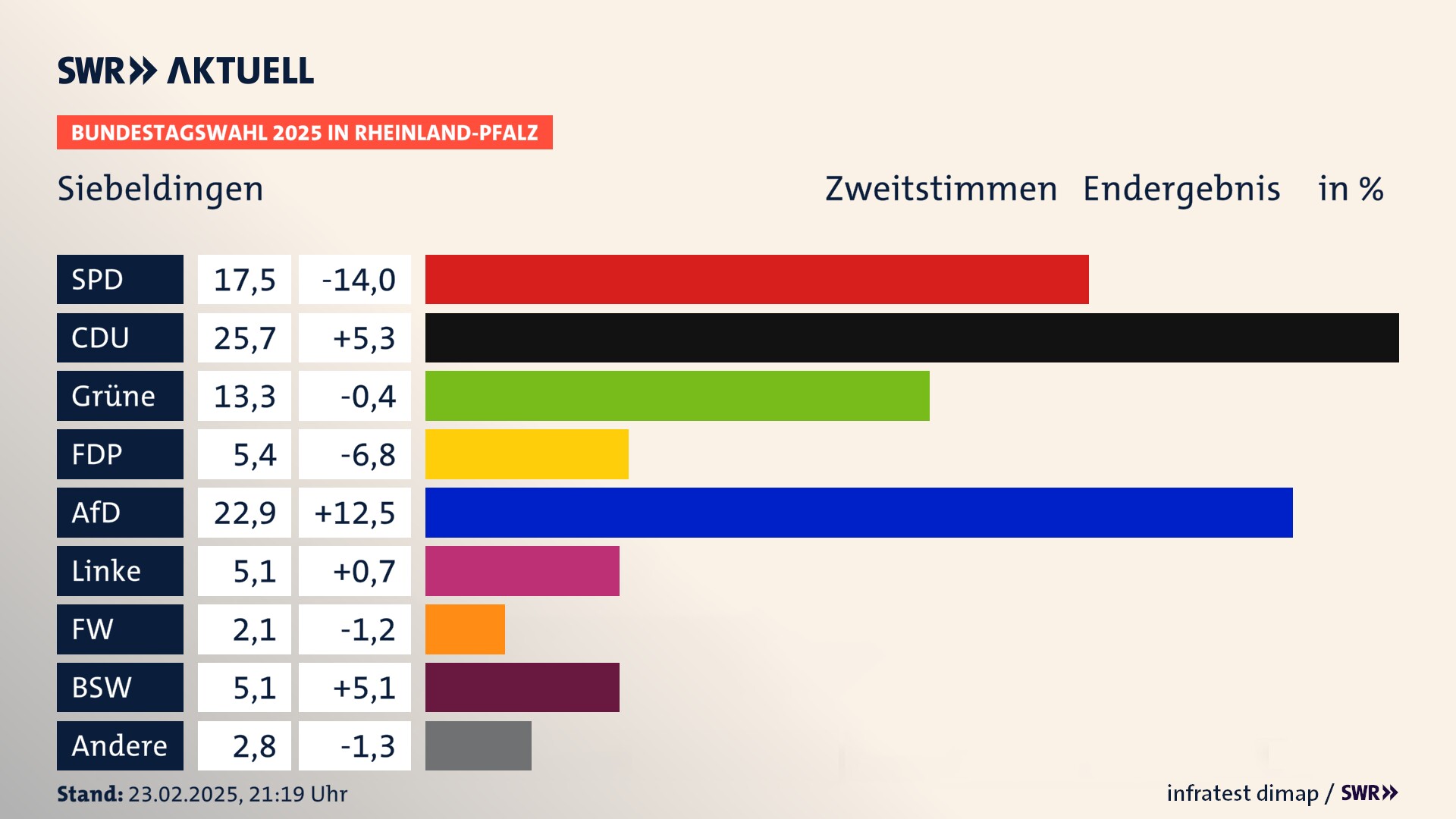 In Siebeldingen verliert die SPD stark (-14,0 Prozentpunkte) und erzielt 17,5 Prozent der gültigen Stimmen. Die CDU erreicht 25,7 Prozent und gewinnt stark (+5,3 Prozentpunkte). Die Grünen erzielen 13,3 Prozent und verlieren leicht (-0,4 Prozentpunkte). Die FDP verliert stark (-6,8 Prozentpunkte) und kommt auf 5,4 Prozent. Die AfD erreicht 22,9 Prozent und gewinnt stark (+12,5 Prozentpunkte). Die Linke erzielt 5,1 Prozent und gewinnt leicht (+0,7 Prozentpunkte). Die Freien Wähler verlieren leicht (-1,2 Prozentpunkte) und kommen auf 2,1 Prozent. Die 2021 nicht angetretene Partei BSW bekommt 5,1 Prozent.