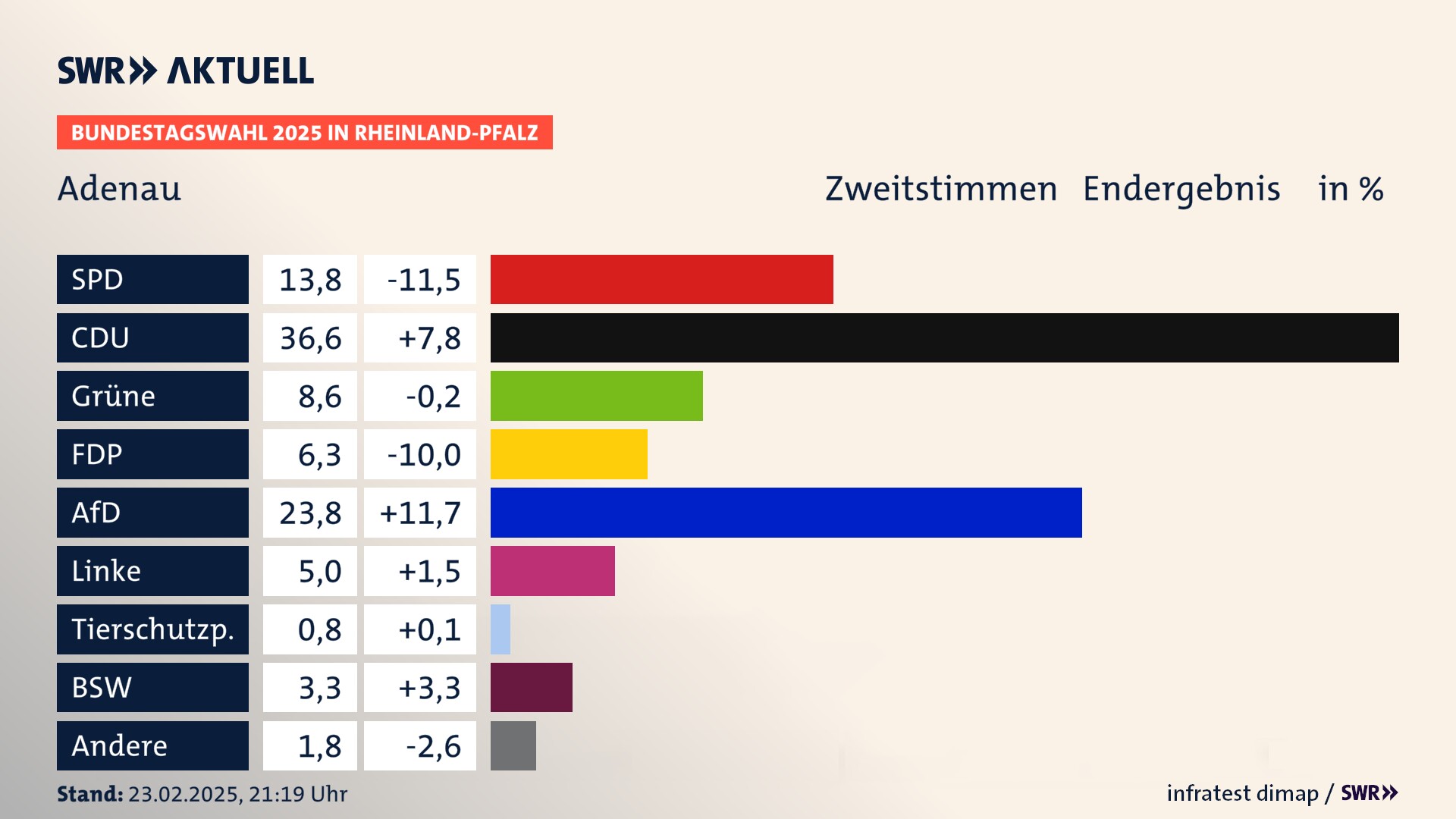 Bundestagswahl 2025 Endergebnis Zweitstimme für Adenau, Stadt. In Adenau, Stadt erzielt die SPD 13,8 Prozent der gültigen  Stimmen. Die CDU landet bei 36,6 Prozent. Die Grünen erreichen 8,6 Prozent. Die FDP kommt auf 6,3 Prozent. Die AfD landet bei 23,8 Prozent. Die Linke erreicht 5,0 Prozent. Die Tierschutzpartei kommt auf 0,8 Prozent. Die 2021 nicht angetretene Partei BSW bekommt 3,3 Prozent.