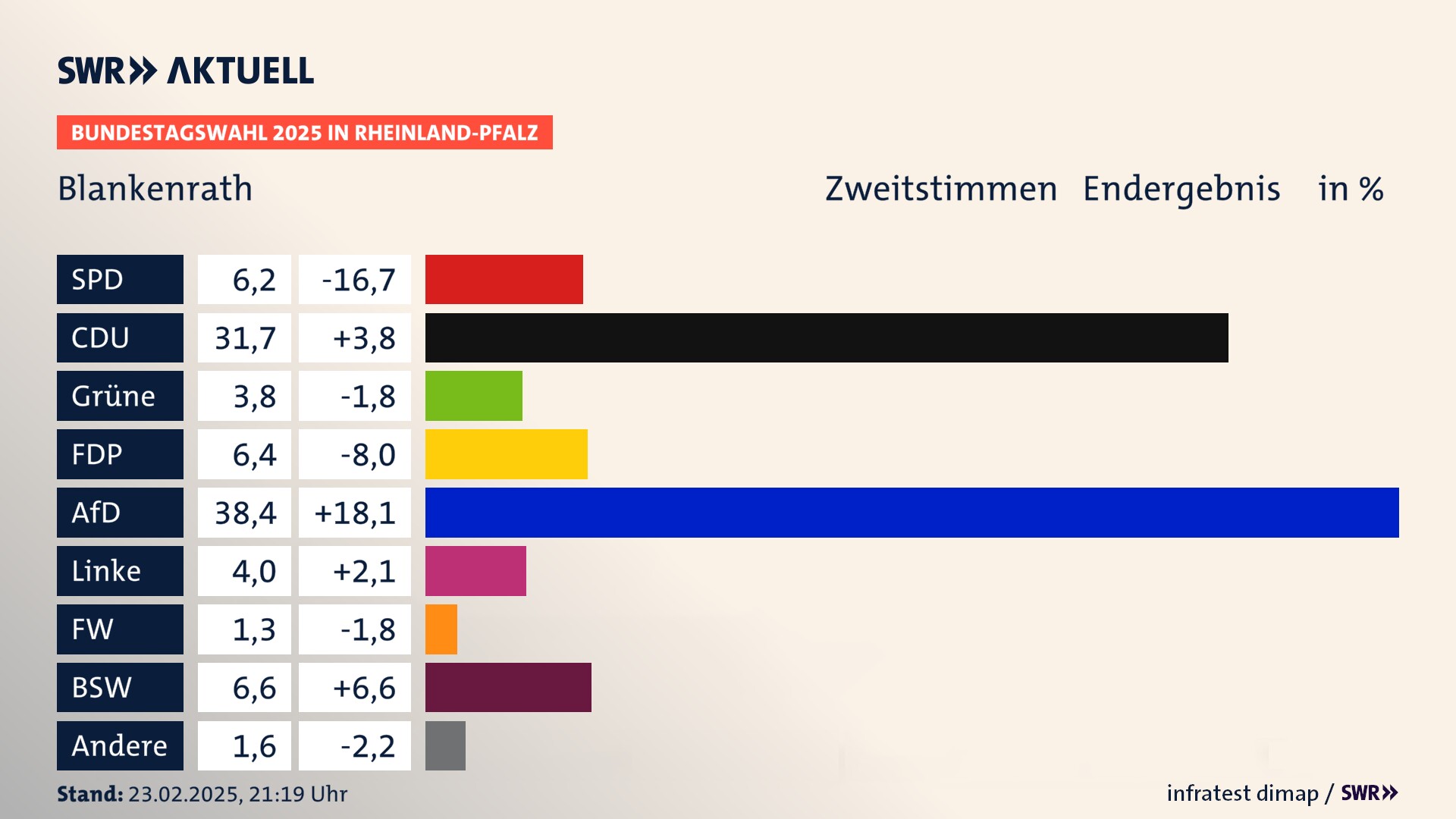 In Blankenrath verliert die SPD stark (-16,7 Prozentpunkte) und erzielt 6,2 Prozent der gültigen Stimmen. Die CDU erreicht 31,7 Prozent und gewinnt deutlich (+3,8 Prozentpunkte). Die Grünen erzielen 3,8 Prozent und verlieren leicht (-1,8 Prozentpunkte). Die FDP verliert stark (-8,0 Prozentpunkte) und kommt auf 6,4 Prozent. Die AfD erreicht 38,4 Prozent und gewinnt stark (+18,1 Prozentpunkte). Die Linke erzielt 4,0 Prozent und gewinnt leicht (+2,1 Prozentpunkte). Die Freien Wähler verlieren leicht (-1,8 Prozentpunkte) und kommen auf 1,3 Prozent. Die 2021 nicht angetretene Partei BSW bekommt 6,6 Prozent.
