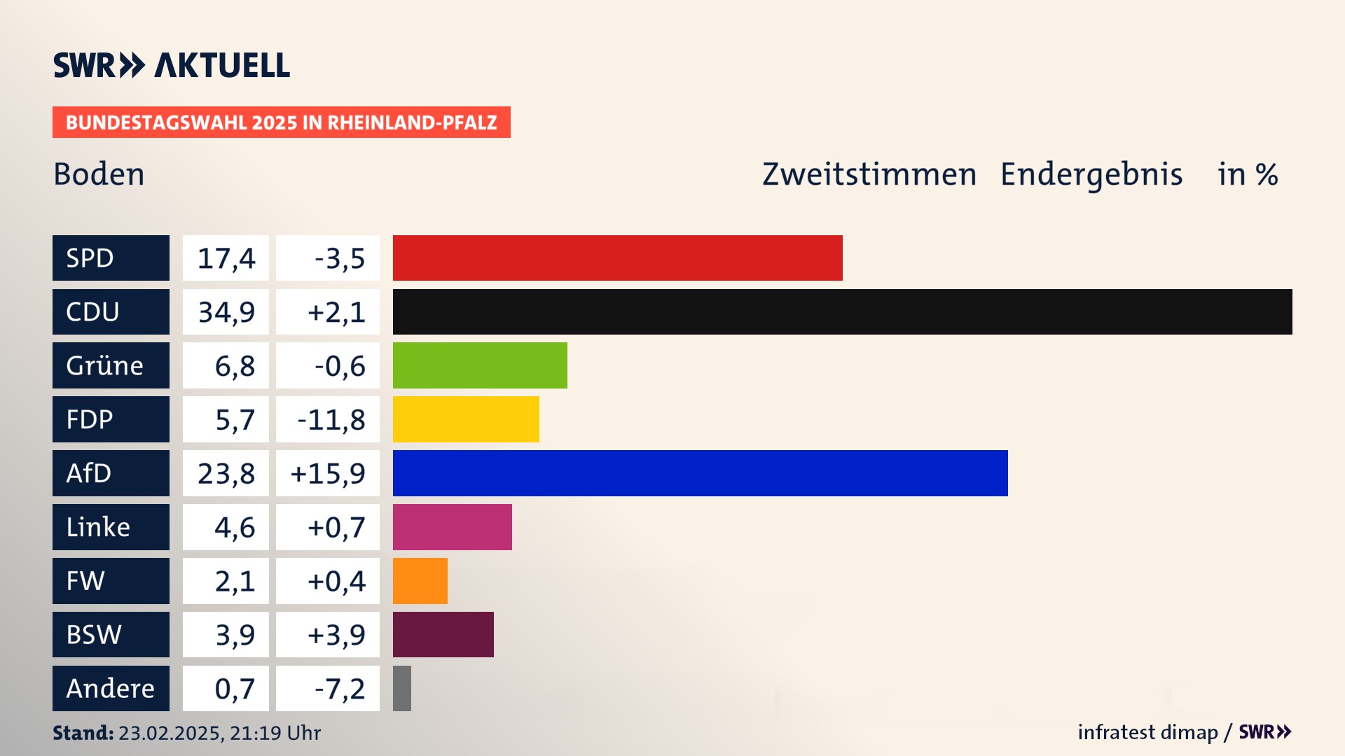In Boden verliert die SPD deutlich (-3,5 Prozentpunkte) und erzielt 17,4 Prozent der gültigen Stimmen. Die CDU erreicht 34,9 Prozent und gewinnt leicht (+2,1 Prozentpunkte). Die Grünen erzielen 6,8 Prozent und verlieren leicht (-0,6 Prozentpunkte). Die FDP verliert stark (-11,8 Prozentpunkte) und kommt auf 5,7 Prozent. Die AfD erreicht 23,8 Prozent und gewinnt stark (+15,9 Prozentpunkte). Die Linke erzielt 4,6 Prozent und gewinnt leicht (+0,7 Prozentpunkte). Die Freien Wähler gewinnen leicht (+0,4 Prozentpunkte) und kommen auf 2,1 Prozent. Die 2021 nicht angetretene Partei BSW bekommt 3,9 Prozent.