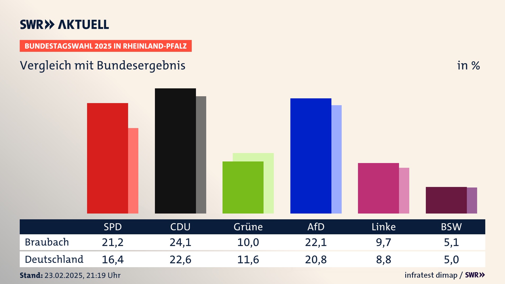 In Braubach verliert die SPD stark (-14,5 Prozentpunkte) und erzielt 21,2 Prozent der gültigen Stimmen. Die CDU erreicht 24,1 Prozent und gewinnt stark (+6,4 Prozentpunkte). Die Grünen erzielen 10,0 Prozent und verlieren deutlich (-4,4 Prozentpunkte). Die FDP verliert stark (-5,7 Prozentpunkte) und kommt auf 3,3 Prozent. Die AfD erreicht 22,1 Prozent und gewinnt stark (+12,7 Prozentpunkte). Die Linke erzielt 9,7 Prozent und gewinnt stark (+5,6 Prozentpunkte). Die Freien Wähler verlieren leicht (-1,3 Prozentpunkte) und kommen auf 2,1 Prozent. Die 2021 nicht angetretene Partei BSW bekommt 5,1 Prozent.