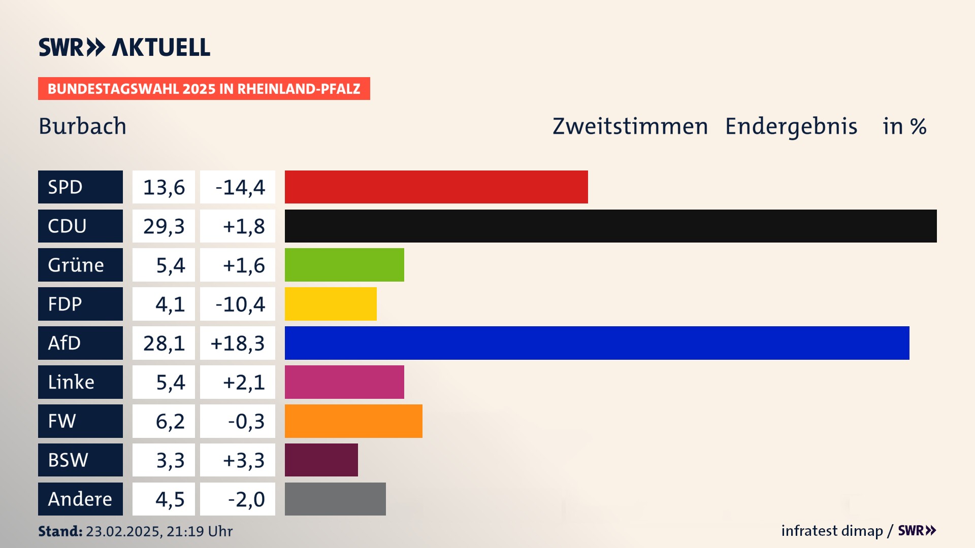 In Burbach verliert die SPD stark (-14,4 Prozentpunkte) und erzielt 13,6 Prozent der gültigen Stimmen. Die CDU erreicht 29,3 Prozent und gewinnt leicht (+1,8 Prozentpunkte). Die Grünen erzielen 5,4 Prozent und gewinnen leicht (+1,6 Prozentpunkte). Die FDP verliert stark (-10,4 Prozentpunkte) und kommt auf 4,1 Prozent. Die AfD erreicht 28,1 Prozent und gewinnt stark (+18,3 Prozentpunkte). Die Linke erzielt 5,4 Prozent und gewinnt leicht (+2,1 Prozentpunkte). Die Freien Wähler verlieren leicht (-0,3 Prozentpunkte) und kommen auf 6,2 Prozent. Die 2021 nicht angetretene Partei BSW bekommt 3,3 Prozent.