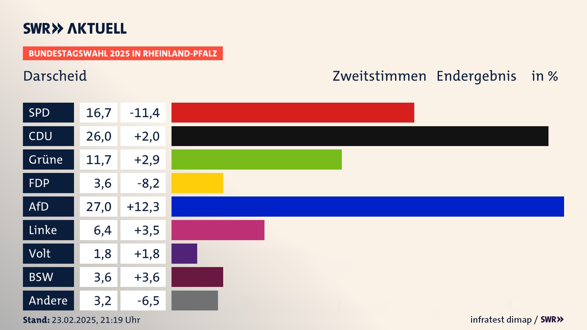 In Darscheid verliert die SPD stark (-11,4 Prozentpunkte) und erzielt 16,7 Prozent der gültigen Stimmen. Die CDU erreicht 26,0 Prozent und gewinnt leicht (+2,0 Prozentpunkte). Die Grünen erzielen 11,7 Prozent und gewinnen leicht (+2,9 Prozentpunkte). Die FDP verliert stark (-8,2 Prozentpunkte) und kommt auf 3,6 Prozent. Die AfD erreicht 27,0 Prozent und gewinnt stark (+12,3 Prozentpunkte). Die Linke erzielt 6,4 Prozent und gewinnt deutlich (+3,5 Prozentpunkte). Die Partei Volt gewinnt leicht (+1,8 Prozentpunkte) und kommt auf 1,8 Prozent. Die 2021 nicht angetretene Partei BSW bekommt 3,6 Prozent.