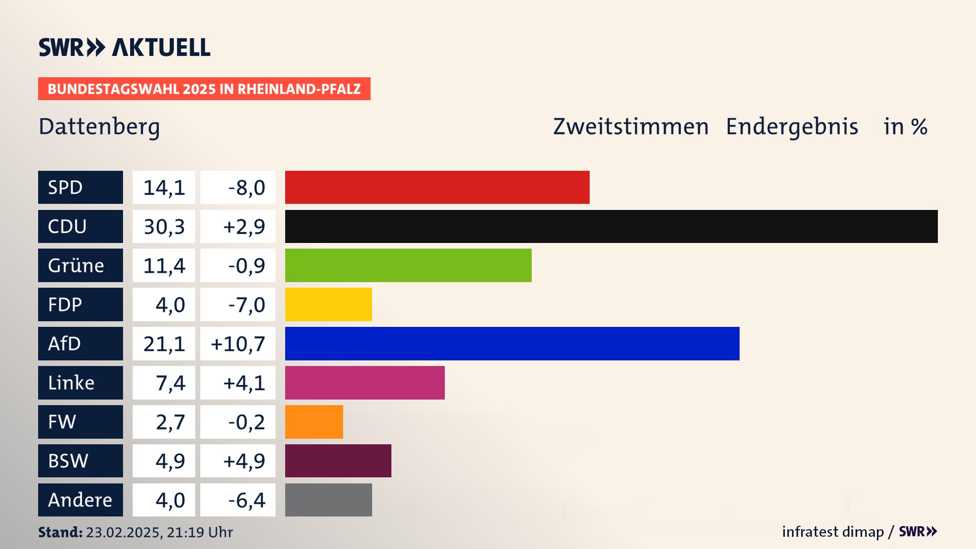 In Dattenberg verliert die SPD stark (-8,0 Prozentpunkte) und erzielt 14,1 Prozent der gültigen Stimmen. Die CDU erreicht 30,3 Prozent und gewinnt leicht (+2,9 Prozentpunkte). Die Grünen erzielen 11,4 Prozent und verlieren leicht (-0,9 Prozentpunkte). Die FDP verliert stark (-7,0 Prozentpunkte) und kommt auf 4,0 Prozent. Die AfD erreicht 21,1 Prozent und gewinnt stark (+10,7 Prozentpunkte). Die Linke erzielt 7,4 Prozent und gewinnt deutlich (+4,1 Prozentpunkte). Die Freien Wähler verlieren leicht (-0,2 Prozentpunkte) und kommen auf 2,7 Prozent. Die 2021 nicht angetretene Partei BSW bekommt 4,9 Prozent.