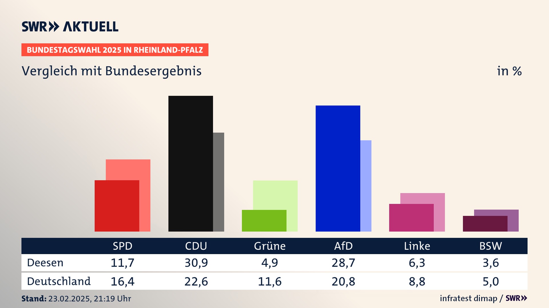 In Deesen verliert die SPD stark (-16,0 Prozentpunkte) und erzielt 11,7 Prozent der gültigen Stimmen. Die CDU erreicht 30,9 Prozent und gewinnt deutlich (+4,4 Prozentpunkte). Die Grünen erzielen 4,9 Prozent und verlieren stark (-6,1 Prozentpunkte). Die FDP verliert deutlich (-4,1 Prozentpunkte) und kommt auf 5,8 Prozent. Die AfD erreicht 28,7 Prozent und gewinnt stark (+17,6 Prozentpunkte). Die Linke erzielt 6,3 Prozent und gewinnt leicht (+0,2 Prozentpunkte). Die Freien Wähler verlieren leicht (-0,7 Prozentpunkte) und kommen auf 3,1 Prozent. Die 2021 nicht angetretene Partei BSW bekommt 3,6 Prozent.