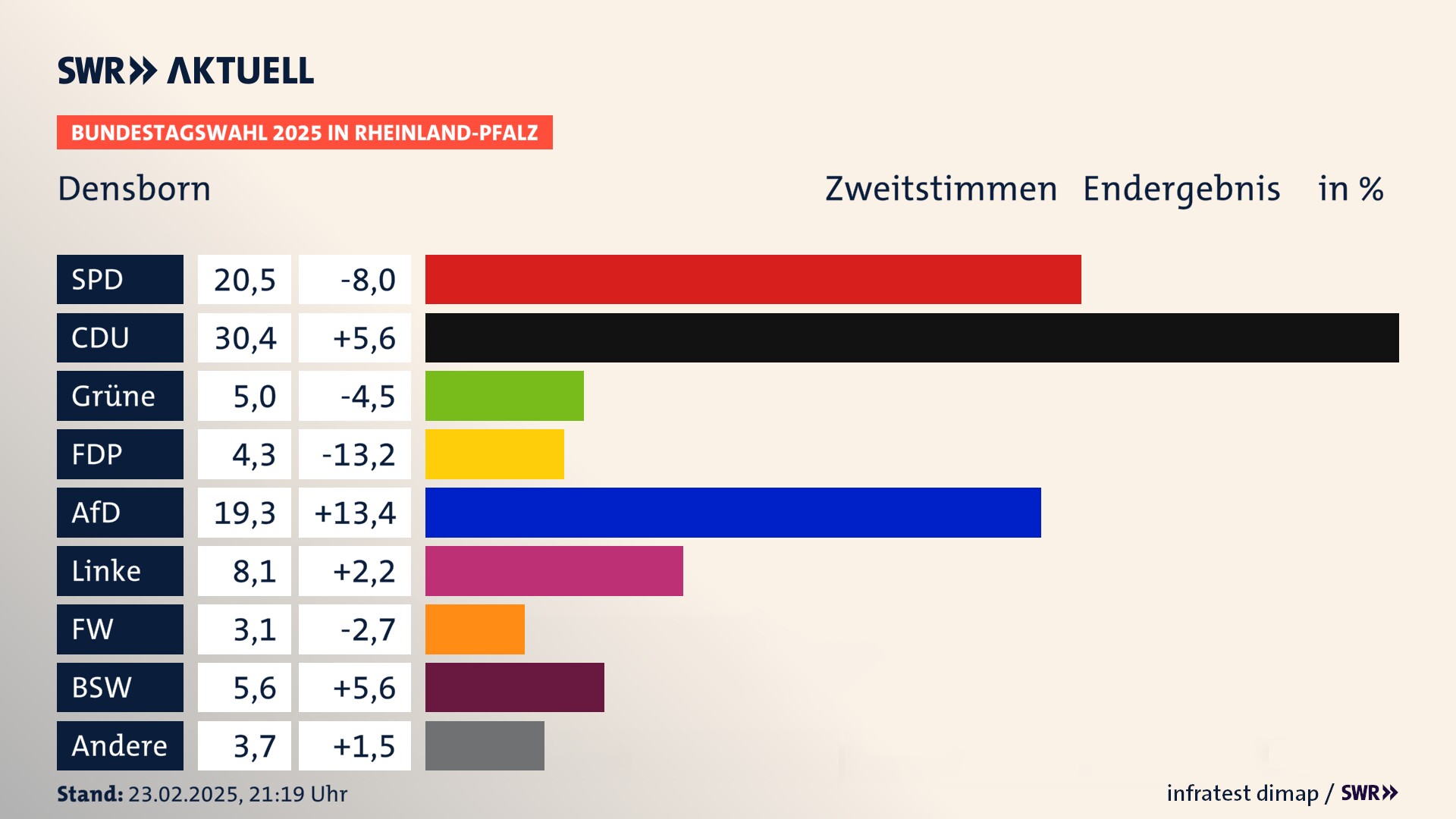 In Densborn verliert die SPD stark (-8,0 Prozentpunkte) und erzielt 20,5 Prozent der gültigen Stimmen. Die CDU erreicht 30,4 Prozent und gewinnt stark (+5,6 Prozentpunkte). Die Grünen erzielen 5,0 Prozent und verlieren deutlich (-4,5 Prozentpunkte). Die FDP verliert stark (-13,2 Prozentpunkte) und kommt auf 4,3 Prozent. Die AfD erreicht 19,3 Prozent und gewinnt stark (+13,4 Prozentpunkte). Die Linke erzielt 8,1 Prozent und gewinnt leicht (+2,2 Prozentpunkte). Die Freien Wähler verlieren leicht (-2,7 Prozentpunkte) und kommen auf 3,1 Prozent. Die 2021 nicht angetretene Partei BSW bekommt 5,6 Prozent.