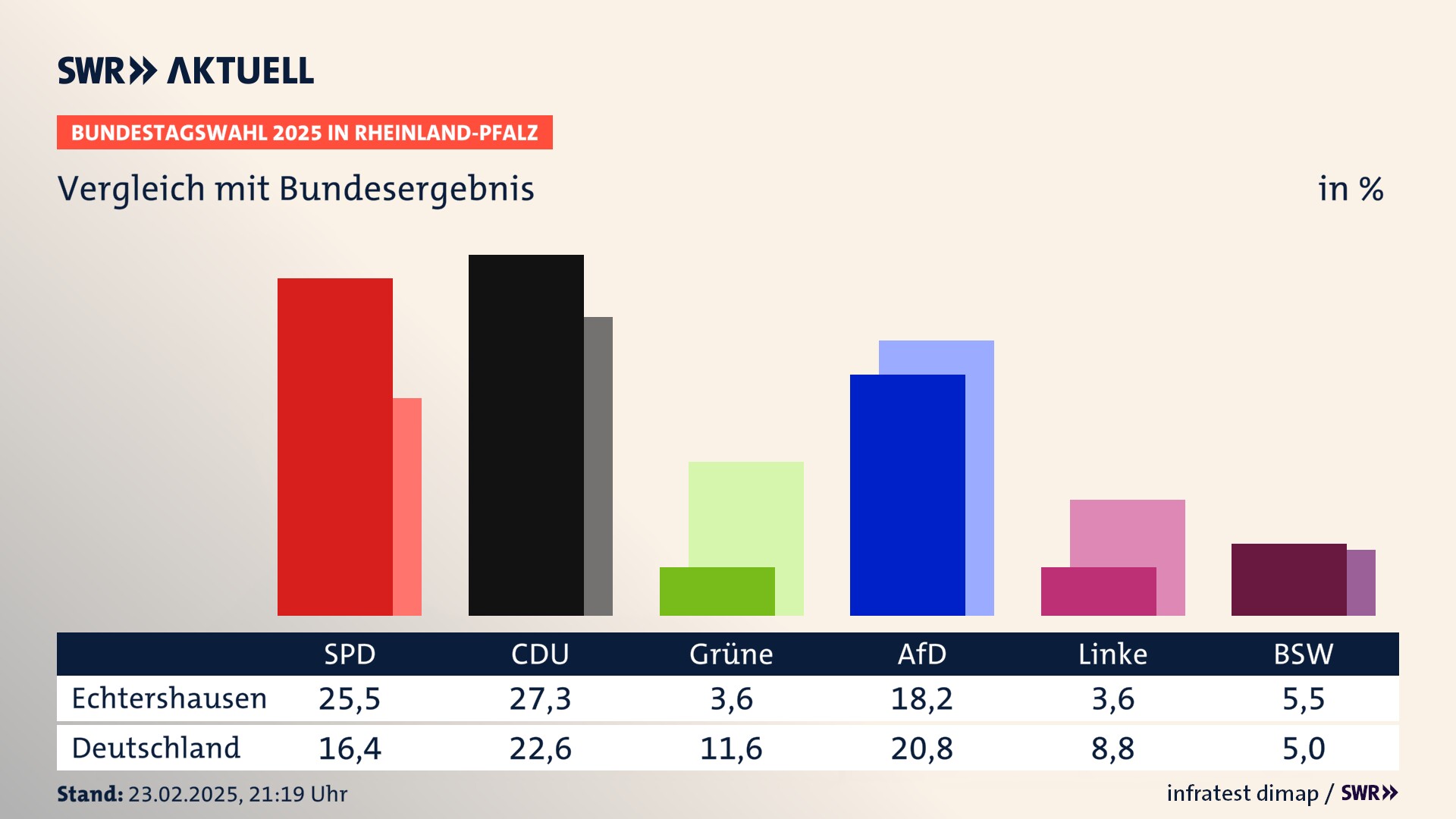 In Echtershausen verliert die SPD stark (-13,4 Prozentpunkte) und erzielt 25,5 Prozent der gültigen Stimmen. Die CDU erreicht 27,3 Prozent und verliert deutlich (-4,2 Prozentpunkte). Die Grünen erzielen 3,6 Prozent und verlieren leicht (-1,9 Prozentpunkte). Die FDP verliert leicht (-1,9 Prozentpunkte) und kommt auf 3,6 Prozent. Die AfD erreicht 18,2 Prozent und gewinnt stark (+12,6 Prozentpunkte). Die Linke erzielt 3,6 Prozent und verliert leicht (-1,9 Prozentpunkte). Die Freien Wähler gewinnen stark (+7,2 Prozentpunkte) und kommen auf 12,7 Prozent. Die 2021 nicht angetretene Partei BSW bekommt 5,5 Prozent.
