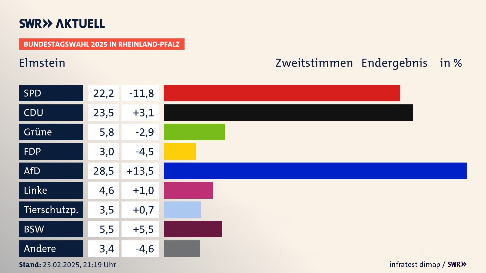Bundestagswahl 2025 Endergebnis Zweitstimme für Elmstein. In Elmstein erzielt die SPD 22,2 Prozent der gültigen  Stimmen. Die CDU landet bei 23,5 Prozent. Die Grünen erreichen 5,8 Prozent. Die FDP kommt auf 3,0 Prozent. Die AfD landet bei 28,5 Prozent. Die Linke erreicht 4,6 Prozent. Die Tierschutzpartei kommt auf 3,5 Prozent. Die 2021 nicht angetretene Partei BSW bekommt 5,5 Prozent.