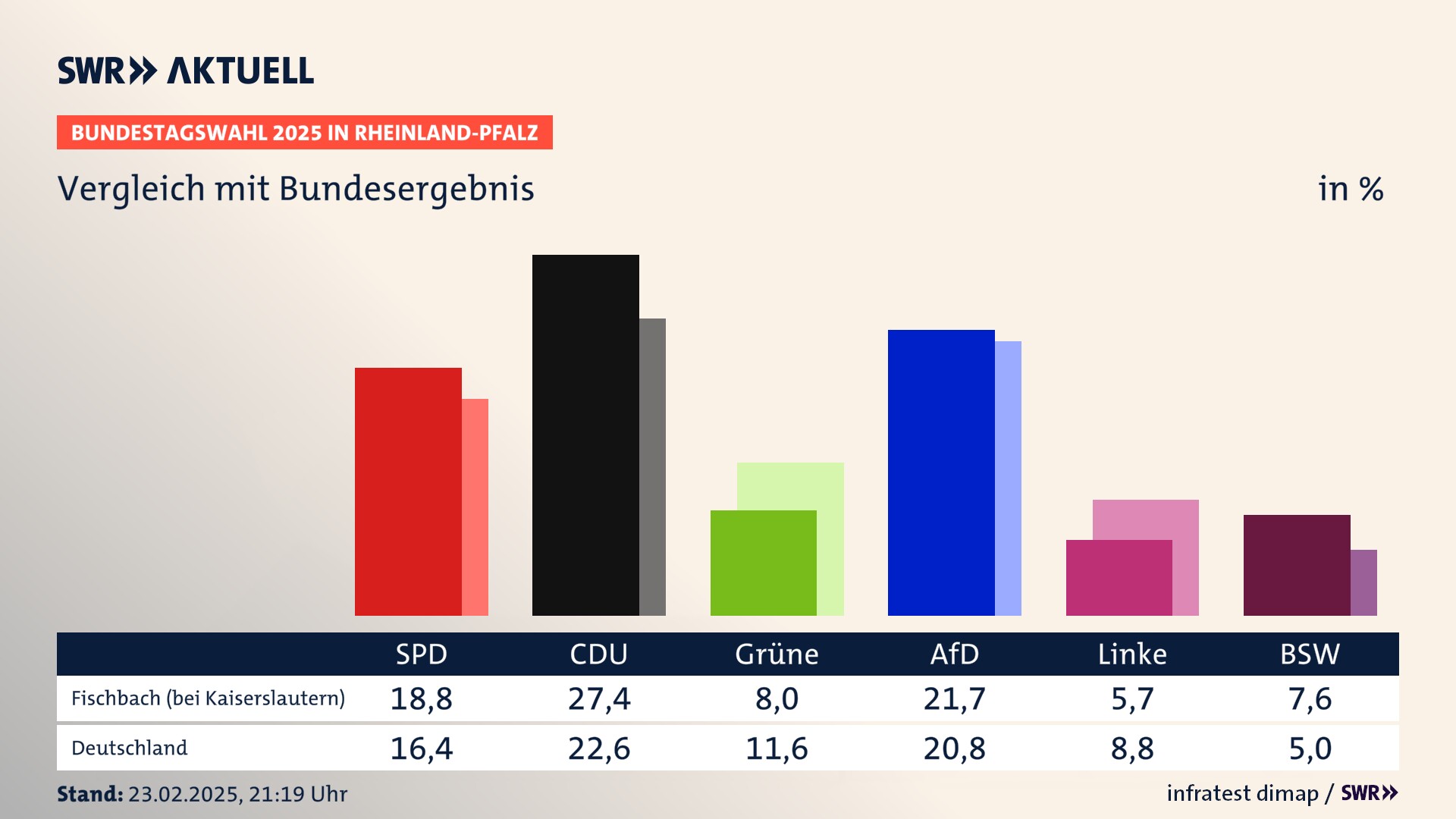 In Fischbach (bei Kaiserslautern) verliert die SPD stark (-6,2 Prozentpunkte) und erzielt 18,8 Prozent der gültigen Stimmen. Die CDU erreicht 27,4 Prozent und gewinnt leicht (+2,0 Prozentpunkte). Die Grünen erzielen 8,0 Prozent und verlieren leicht (-2,9 Prozentpunkte). Die FDP verliert deutlich (-3,9 Prozentpunkte) und kommt auf 5,7 Prozent. Die AfD erreicht 21,7 Prozent und gewinnt stark (+9,2 Prozentpunkte). Die Linke erzielt 5,7 Prozent und gewinnt leicht (+0,3 Prozentpunkte). Die Freien Wähler verlieren deutlich (-3,2 Prozentpunkte) und kommen auf 2,2 Prozent. Die 2021 nicht angetretene Partei BSW bekommt 7,6 Prozent.