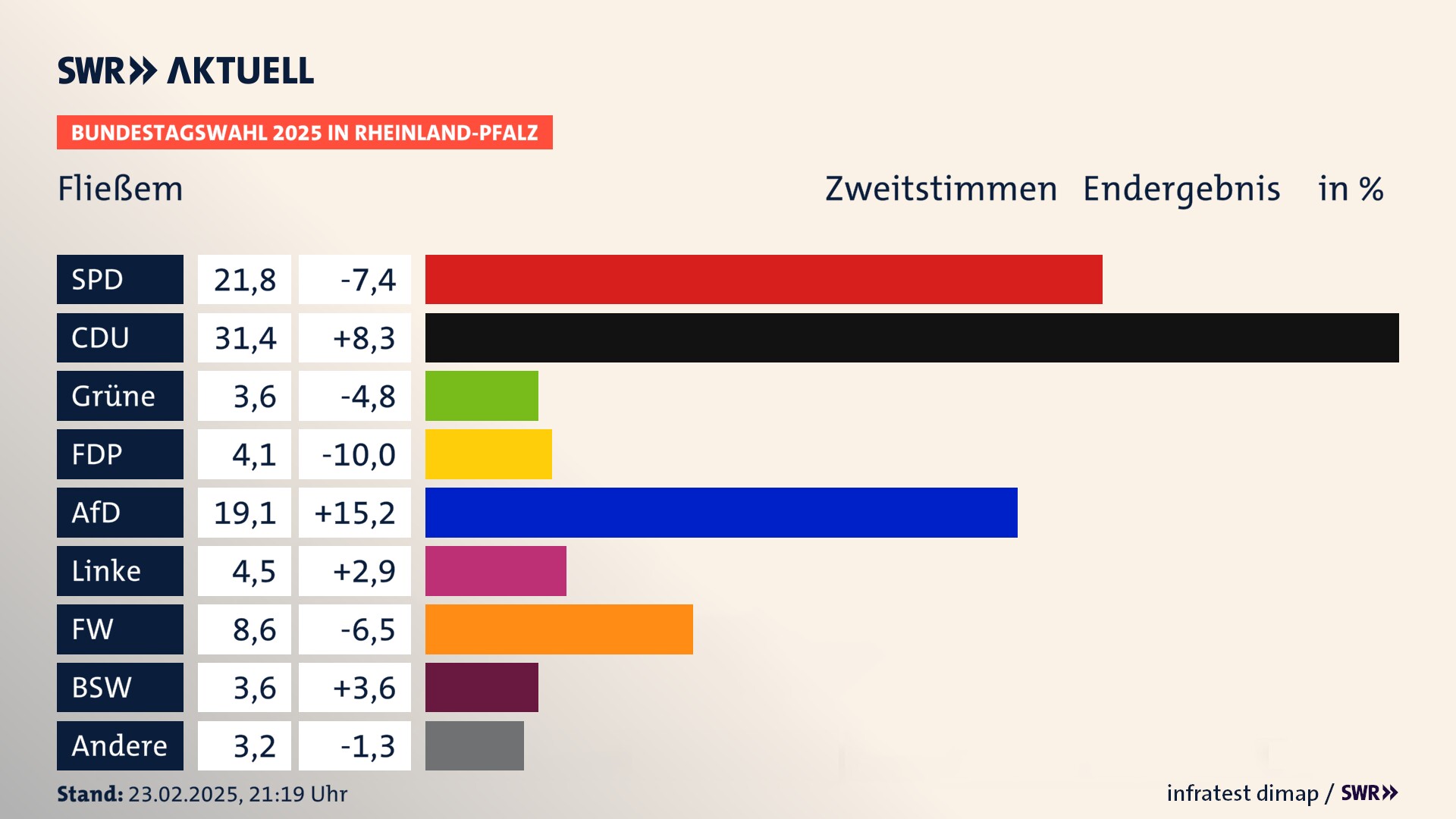 In Fließem verliert die SPD stark (-7,4 Prozentpunkte) und erzielt 21,8 Prozent der gültigen Stimmen. Die CDU erreicht 31,4 Prozent und gewinnt stark (+8,3 Prozentpunkte). Die Grünen erzielen 3,6 Prozent und verlieren deutlich (-4,8 Prozentpunkte). Die FDP verliert stark (-10,0 Prozentpunkte) und kommt auf 4,1 Prozent. Die AfD erreicht 19,1 Prozent und gewinnt stark (+15,2 Prozentpunkte). Die Linke erzielt 4,5 Prozent und gewinnt leicht (+2,9 Prozentpunkte). Die Freien Wähler verlieren stark (-6,5 Prozentpunkte) und kommen auf 8,6 Prozent. Die 2021 nicht angetretene Partei BSW bekommt 3,6 Prozent.