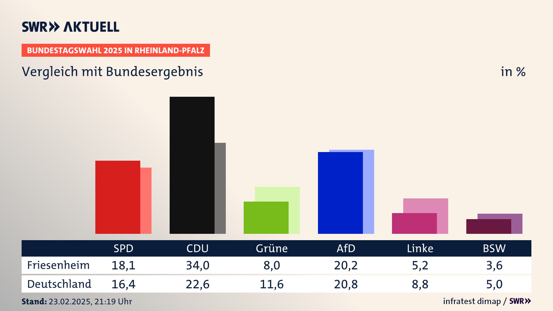 Bundestagswahl 2025 Endergebnis Zweitstimme für Friesenheim. In Friesenheim erzielt die SPD 18,1 Prozent der gültigen  Stimmen. Die CDU landet bei 34,0 Prozent. Die Grünen erreichen 8,0 Prozent. Die FDP kommt auf 4,0 Prozent. Die AfD landet bei 20,2 Prozent. Die Linke erreicht 5,2 Prozent. Die Freien Wähler kommen auf 3,4 Prozent. Die 2021 nicht angetretene Partei BSW bekommt 3,6 Prozent.