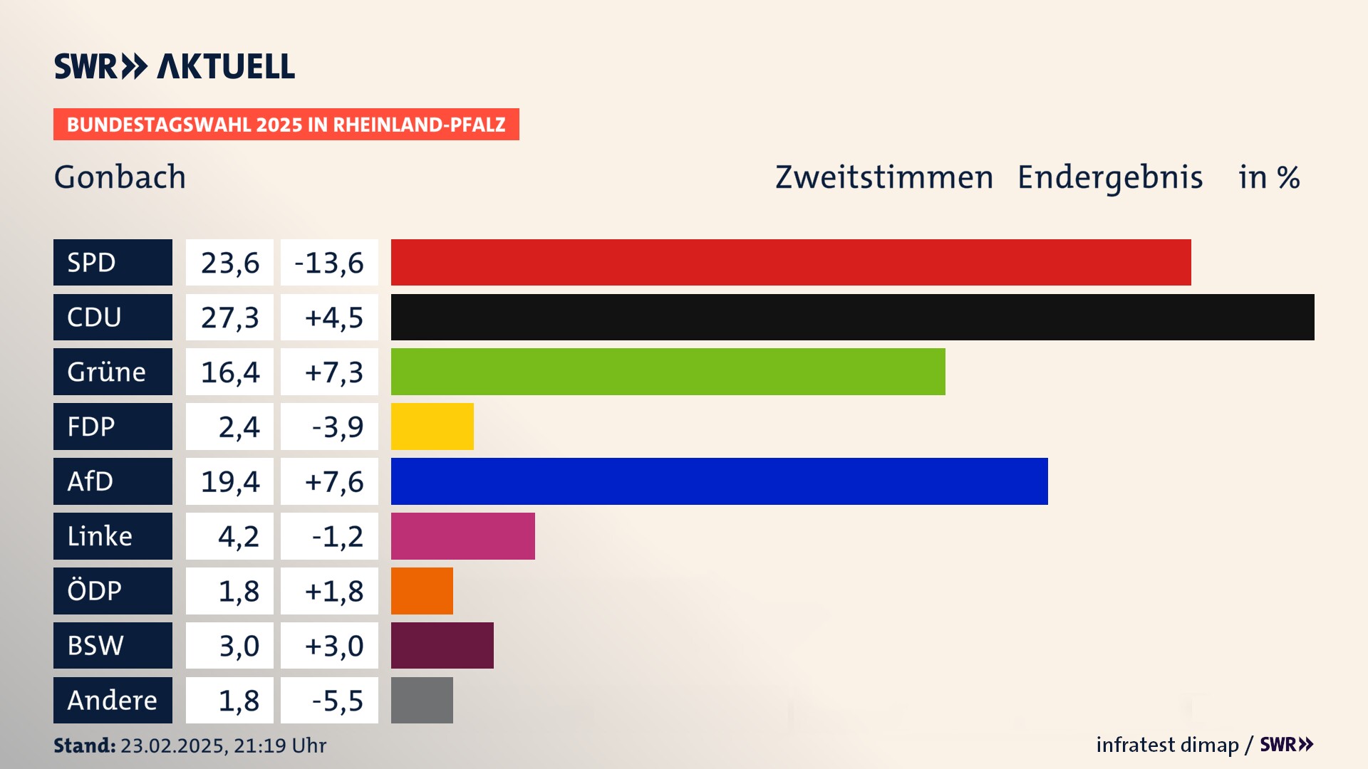 Bundestagswahl 2025 Endergebnis Zweitstimme für Gonbach. In Gonbach erzielt die SPD 23,6 Prozent der gültigen  Stimmen. Die CDU landet bei 27,3 Prozent. Die Grünen erreichen 16,4 Prozent. Die FDP kommt auf 2,4 Prozent. Die AfD landet bei 19,4 Prozent. Die Linke erreicht 4,2 Prozent. Die ÖDP kommt auf 1,8 Prozent. Die 2021 nicht angetretene Partei BSW bekommt 3,0 Prozent.