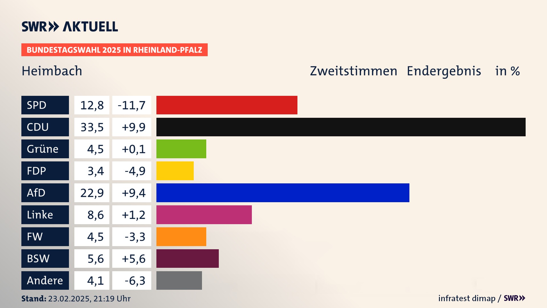 Bundestagswahl 2025 Endergebnis Zweitstimme für Heimbach. In Heimbach erzielt die SPD 12,8 Prozent der gültigen  Stimmen. Die CDU landet bei 33,5 Prozent. Die Grünen erreichen 4,5 Prozent. Die FDP kommt auf 3,4 Prozent. Die AfD landet bei 22,9 Prozent. Die Linke erreicht 8,6 Prozent. Die Freien Wähler kommen auf 4,5 Prozent. Die 2021 nicht angetretene Partei BSW bekommt 5,6 Prozent.