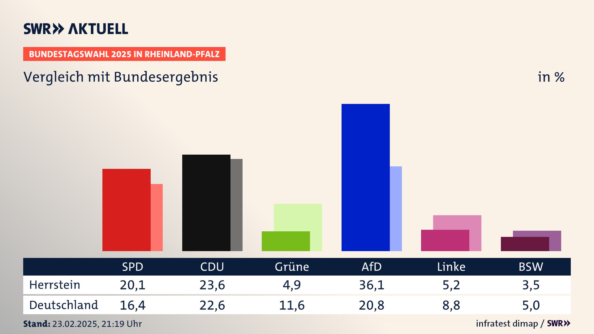 In Herrstein verliert die SPD stark (-13,8 Prozentpunkte) und erzielt 20,1 Prozent der gültigen Stimmen. Die CDU erreicht 23,6 Prozent und verliert leicht (-2,9 Prozentpunkte). Die Grünen erzielen 4,9 Prozent und gewinnen leicht (+0,2 Prozentpunkte). Die FDP verliert stark (-7,1 Prozentpunkte) und kommt auf 3,1 Prozent. Die AfD erreicht 36,1 Prozent und gewinnt stark (+22,6 Prozentpunkte). Die Linke erzielt 5,2 Prozent und gewinnt leicht (+1,5 Prozentpunkte). Die Tierschutzpartei landet wie bei der letzten Wahl unverändert bei 1,4 Prozent. Die 2021 nicht angetretene Partei BSW bekommt 3,5 Prozent.
