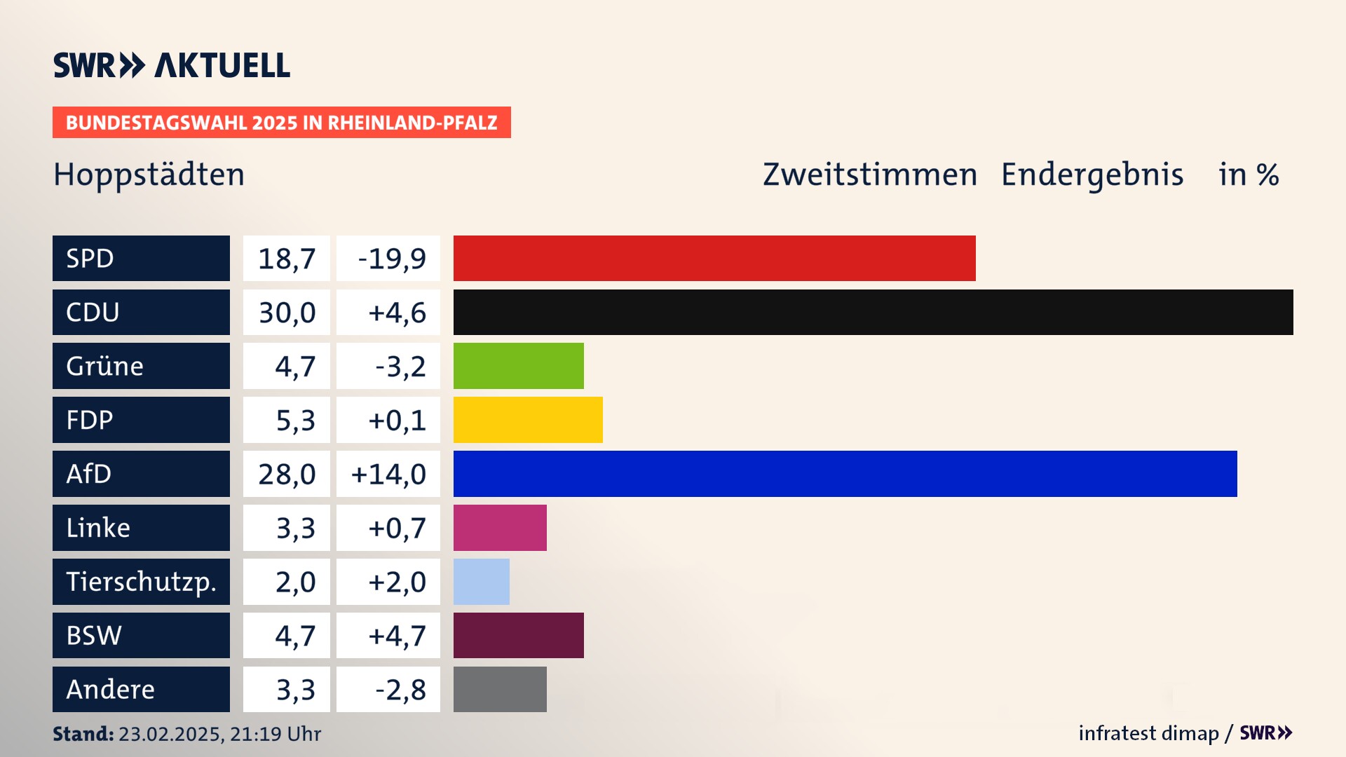 In Hoppstädten verliert die SPD stark (-19,9 Prozentpunkte) und erzielt 18,7 Prozent der gültigen Stimmen. Die CDU erreicht 30,0 Prozent und gewinnt deutlich (+4,6 Prozentpunkte). Die Grünen erzielen 4,7 Prozent und verlieren deutlich (-3,2 Prozentpunkte). Die FDP gewinnt leicht (+0,1 Prozentpunkte) und kommt auf 5,3 Prozent. Die AfD erreicht 28,0 Prozent und gewinnt stark (+14,0 Prozentpunkte). Die Linke erzielt 3,3 Prozent und gewinnt leicht (+0,7 Prozentpunkte). Die Tierschutzpartei gewinnt leicht (+2,0 Prozentpunkte) und kommt auf 2,0 Prozent. Die 2021 nicht angetretene Partei BSW bekommt 4,7 Prozent.