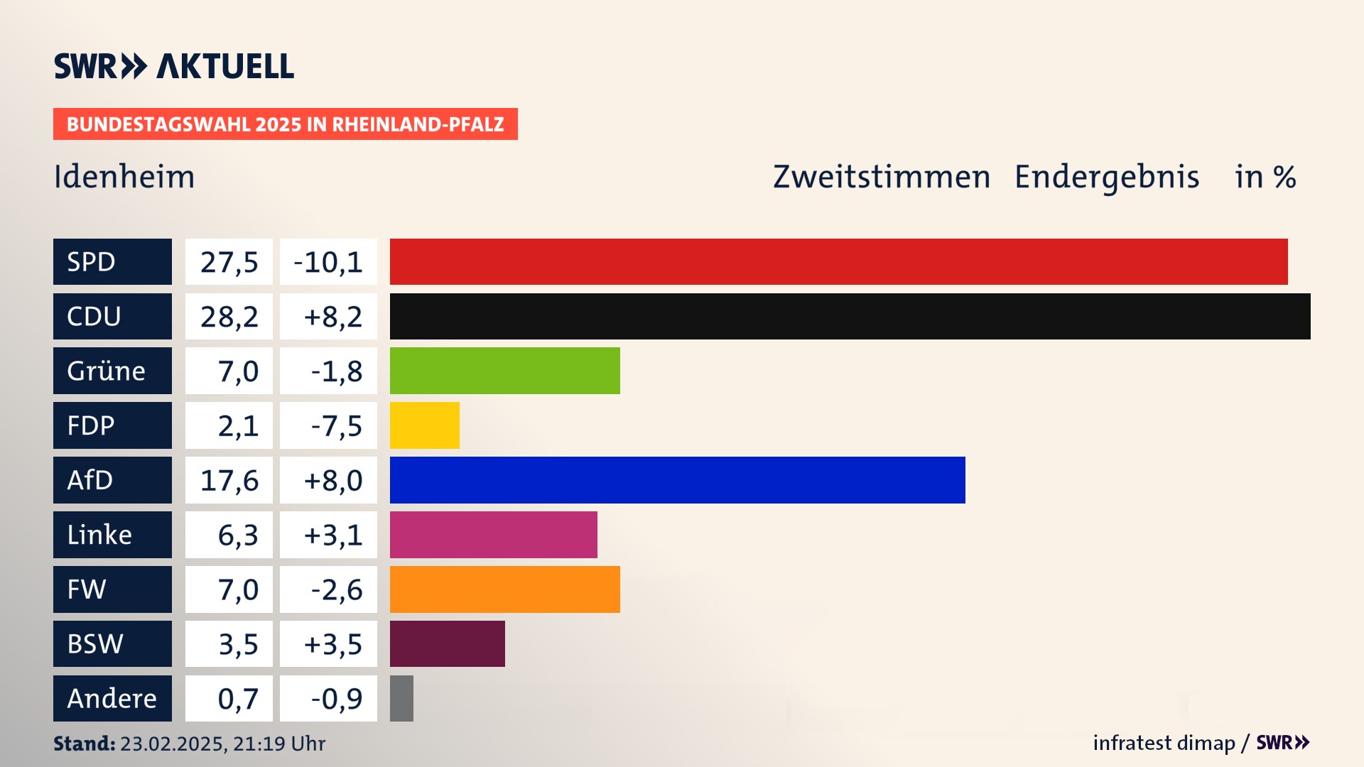 In Idenheim verliert die SPD stark (-10,1 Prozentpunkte) und erzielt 27,5 Prozent der gültigen Stimmen. Die CDU erreicht 28,2 Prozent und gewinnt stark (+8,2 Prozentpunkte). Die Grünen erzielen 7,0 Prozent und verlieren leicht (-1,8 Prozentpunkte). Die FDP verliert stark (-7,5 Prozentpunkte) und kommt auf 2,1 Prozent. Die AfD erreicht 17,6 Prozent und gewinnt stark (+8,0 Prozentpunkte). Die Linke erzielt 6,3 Prozent und gewinnt deutlich (+3,1 Prozentpunkte). Die Freien Wähler verlieren leicht (-2,6 Prozentpunkte) und kommen auf 7,0 Prozent. Die 2021 nicht angetretene Partei BSW bekommt 3,5 Prozent.