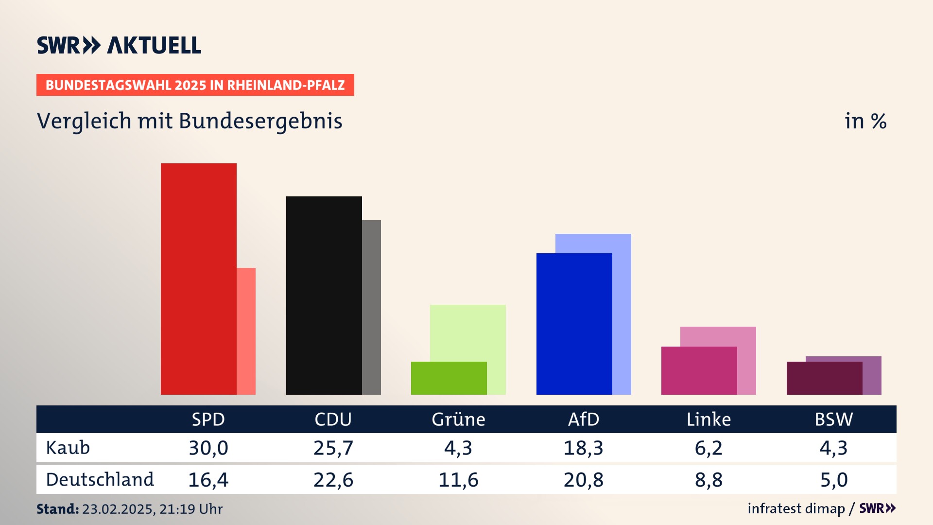 In Kaub verliert die SPD stark (-7,3 Prozentpunkte) und erzielt 30,0 Prozent der gültigen Stimmen. Die CDU erreicht 25,7 Prozent und gewinnt stark (+8,3 Prozentpunkte). Die Grünen erzielen 4,3 Prozent und verlieren deutlich (-4,4 Prozentpunkte). Die FDP verliert leicht (-0,6 Prozentpunkte) und kommt auf 6,2 Prozent. Die AfD erreicht 18,3 Prozent und gewinnt stark (+9,0 Prozentpunkte). Die Linke erzielt 6,2 Prozent und gewinnt leicht (+1,3 Prozentpunkte). Die Freien Wähler verlieren leicht (-1,0 Prozentpunkte) und kommen auf 2,7 Prozent. Die 2021 nicht angetretene Partei BSW bekommt 4,3 Prozent.
