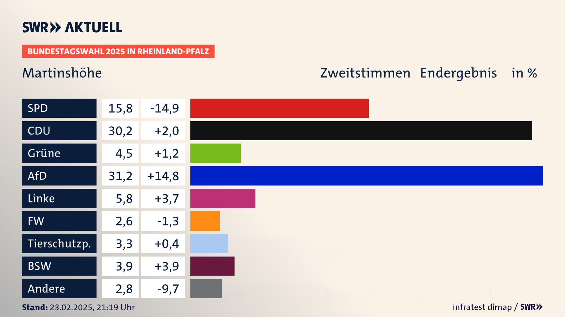In Martinshöhe verliert die SPD stark (-14,9 Prozentpunkte) und erzielt 15,8 Prozent der gültigen Stimmen. Die CDU erreicht 30,2 Prozent und gewinnt leicht (+2,0 Prozentpunkte). Die Grünen erzielen 4,5 Prozent und gewinnen leicht (+1,2 Prozentpunkte). Die AfD gewinnt stark (+14,8 Prozentpunkte) und kommt auf 31,2 Prozent. Die Linke erreicht 5,8 Prozent und gewinnt deutlich (+3,7 Prozentpunkte). Die Freien Wähler erzielen 2,6 Prozent und verlieren leicht (-1,3 Prozentpunkte). Die Tierschutzpartei gewinnt leicht (+0,4 Prozentpunkte) und kommt auf 3,3 Prozent. Die 2021 nicht angetretene Partei BSW bekommt 3,9 Prozent.