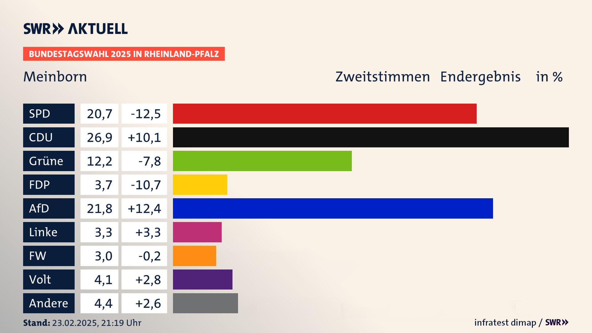 In Meinborn verliert die SPD stark (-12,5 Prozentpunkte) und erzielt 20,7 Prozent der gültigen Stimmen. Die CDU erreicht 26,9 Prozent und gewinnt stark (+10,1 Prozentpunkte). Die Grünen erzielen 12,2 Prozent und verlieren stark (-7,8 Prozentpunkte). Die FDP verliert stark (-10,7 Prozentpunkte) und kommt auf 3,7 Prozent. Die AfD erreicht 21,8 Prozent und gewinnt stark (+12,4 Prozentpunkte). Die Linke erzielt 3,3 Prozent und gewinnt deutlich (+3,3 Prozentpunkte). Die Freien Wähler verlieren leicht (-0,2 Prozentpunkte) und kommen auf 3,0 Prozent. Die Partei Volt erreicht 4,1 Prozent und gewinnt leicht (+2,8 Prozentpunkte).