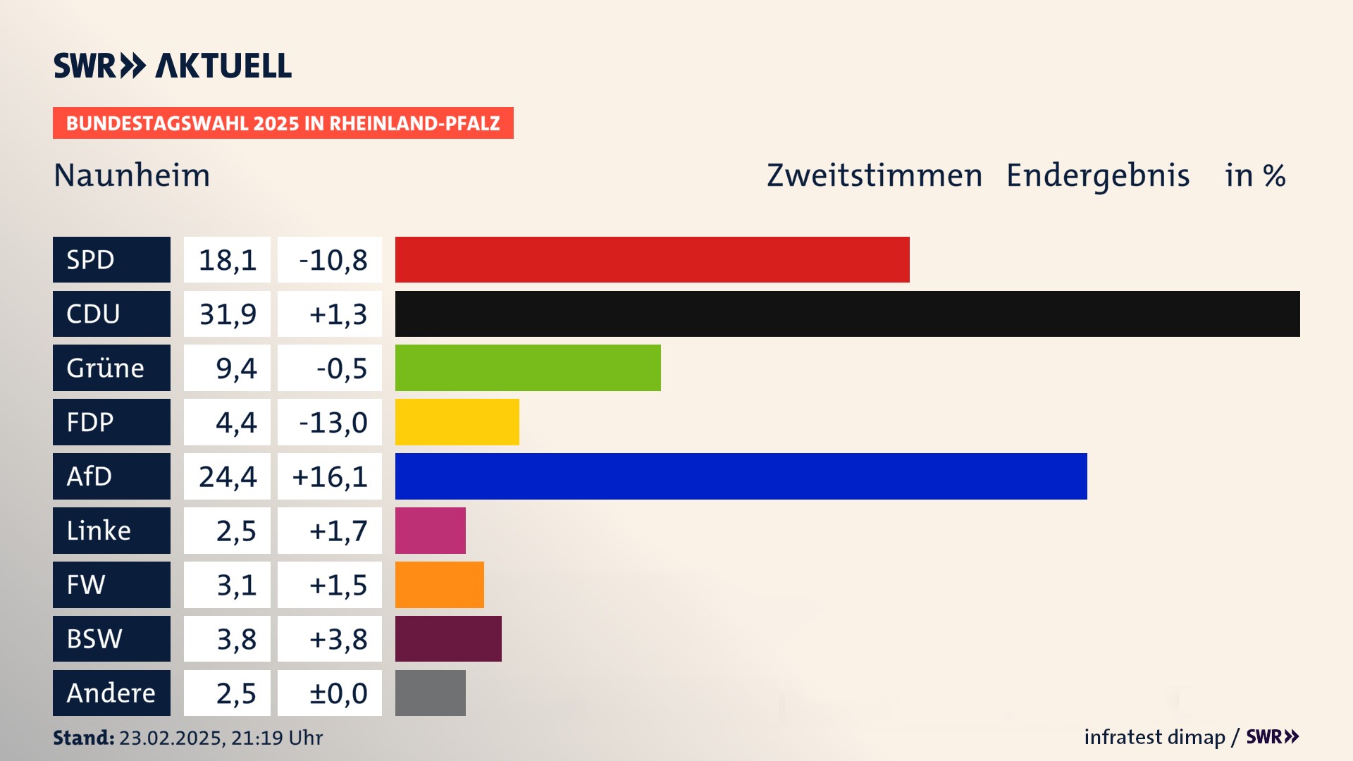 In Naunheim verliert die SPD stark (-10,8 Prozentpunkte) und erzielt 18,1 Prozent der gültigen Stimmen. Die CDU erreicht 31,9 Prozent und gewinnt leicht (+1,3 Prozentpunkte). Die Grünen erzielen 9,4 Prozent und verlieren leicht (-0,5 Prozentpunkte). Die FDP verliert stark (-13,0 Prozentpunkte) und kommt auf 4,4 Prozent. Die AfD erreicht 24,4 Prozent und gewinnt stark (+16,1 Prozentpunkte). Die Linke erzielt 2,5 Prozent und gewinnt leicht (+1,7 Prozentpunkte). Die Freien Wähler gewinnen leicht (+1,5 Prozentpunkte) und kommen auf 3,1 Prozent. Die 2021 nicht angetretene Partei BSW bekommt 3,8 Prozent.