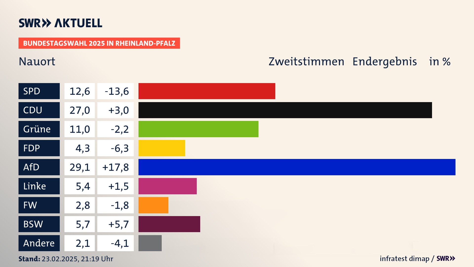 In Nauort verliert die SPD stark (-13,6 Prozentpunkte) und erzielt 12,6 Prozent der gültigen Stimmen. Die CDU erreicht 27,0 Prozent und gewinnt deutlich (+3,0 Prozentpunkte). Die Grünen erzielen 11,0 Prozent und verlieren leicht (-2,2 Prozentpunkte). Die FDP verliert stark (-6,3 Prozentpunkte) und kommt auf 4,3 Prozent. Die AfD erreicht 29,1 Prozent und gewinnt stark (+17,8 Prozentpunkte). Die Linke erzielt 5,4 Prozent und gewinnt leicht (+1,5 Prozentpunkte). Die Freien Wähler verlieren leicht (-1,8 Prozentpunkte) und kommen auf 2,8 Prozent. Die 2021 nicht angetretene Partei BSW bekommt 5,7 Prozent.