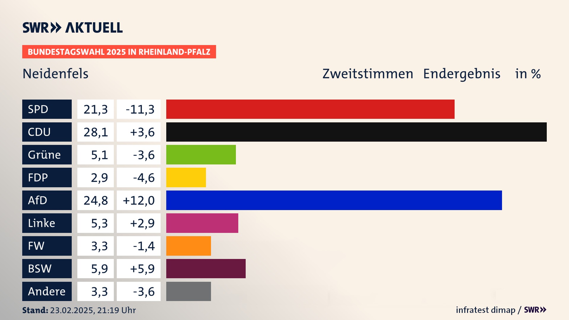 In Neidenfels verliert die SPD stark (-11,3 Prozentpunkte) und erzielt 21,3 Prozent der gültigen Stimmen. Die CDU erreicht 28,1 Prozent und gewinnt deutlich (+3,6 Prozentpunkte). Die Grünen erzielen 5,1 Prozent und verlieren deutlich (-3,6 Prozentpunkte). Die FDP verliert deutlich (-4,6 Prozentpunkte) und kommt auf 2,9 Prozent. Die AfD erreicht 24,8 Prozent und gewinnt stark (+12,0 Prozentpunkte). Die Linke erzielt 5,3 Prozent und gewinnt leicht (+2,9 Prozentpunkte). Die Freien Wähler verlieren leicht (-1,4 Prozentpunkte) und kommen auf 3,3 Prozent. Die 2021 nicht angetretene Partei BSW bekommt 5,9 Prozent.
