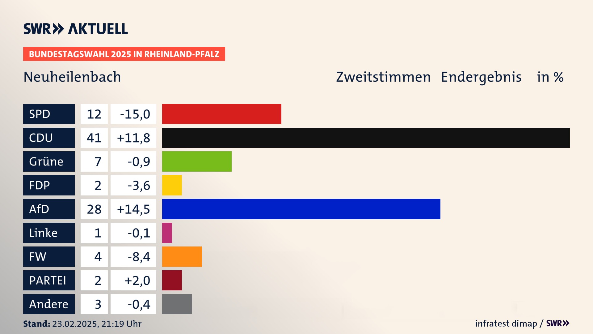 Bundestagswahl 2025 Endergebnis Zweitstimme für Neuheilenbach. In Neuheilenbach erzielt die SPD 12,0 Prozent der gültigen  Stimmen. Die CDU landet bei 41,0 Prozent. Die Grünen erreichen 7,0 Prozent. Die FDP kommt auf 2,0 Prozent. Die AfD landet bei 28,0 Prozent. Die Freien Wähler erreichen 4,0 Prozent. Die Partei kommt auf 2,0 Prozent. Die 2021 nicht angetretene Partei BSW bekommt 1,0 Prozent.