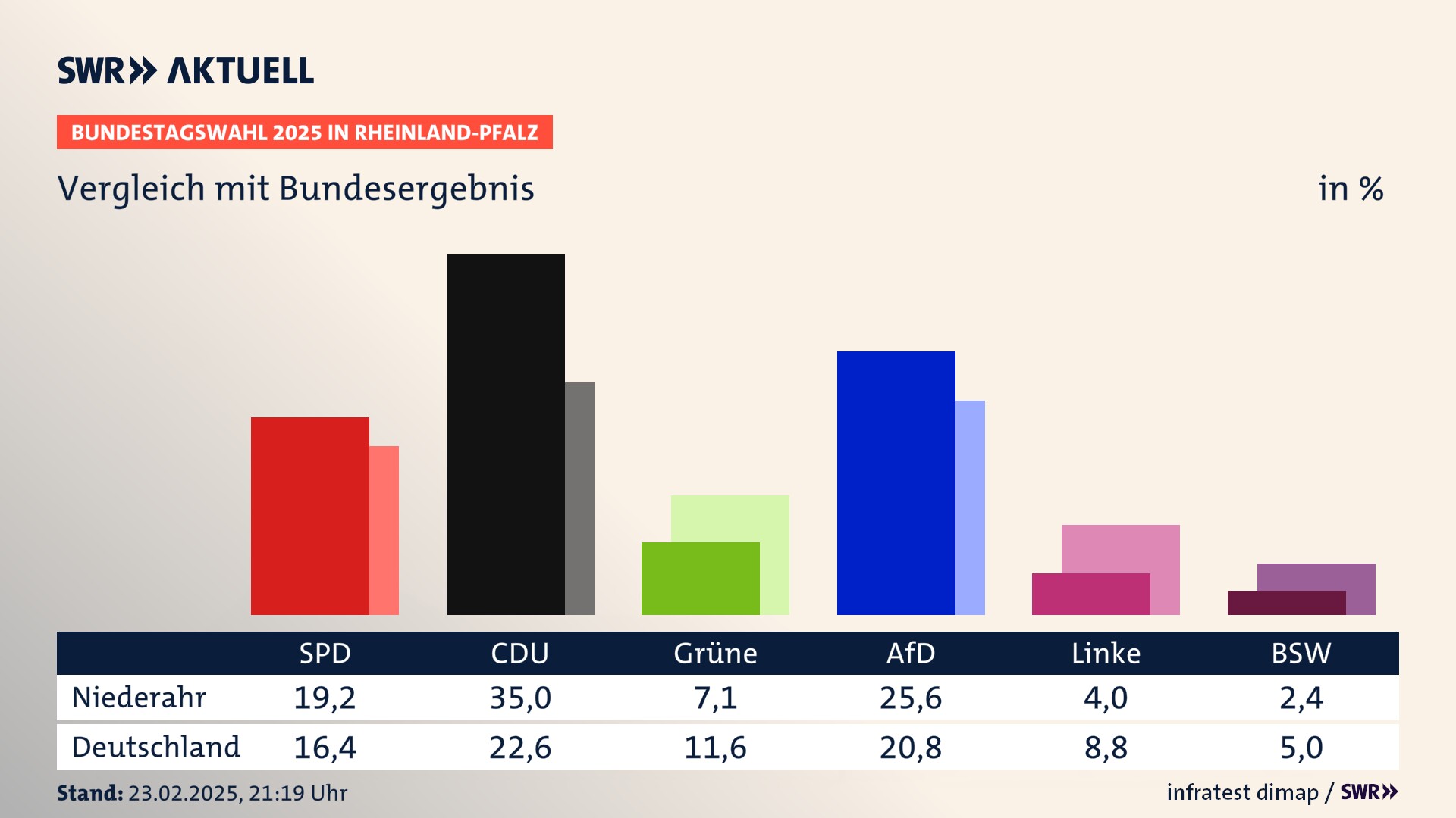 In Niederahr verliert die SPD stark (-7,9 Prozentpunkte) und erzielt 19,2 Prozent der gültigen Stimmen. Die CDU erreicht 35,0 Prozent und gewinnt leicht (+2,1 Prozentpunkte). Die Grünen erzielen 7,1 Prozent und gewinnen leicht (+0,6 Prozentpunkte). Die FDP verliert deutlich (-4,5 Prozentpunkte) und kommt auf 2,0 Prozent. Die AfD erreicht 25,6 Prozent und gewinnt stark (+15,6 Prozentpunkte). Die Linke erzielt 4,0 Prozent und verliert leicht (-1,3 Prozentpunkte). Die Freien Wähler gewinnen leicht (+0,2 Prozentpunkte) und kommen auf 3,7 Prozent. Die 2021 nicht angetretene Partei BSW bekommt 2,4 Prozent.