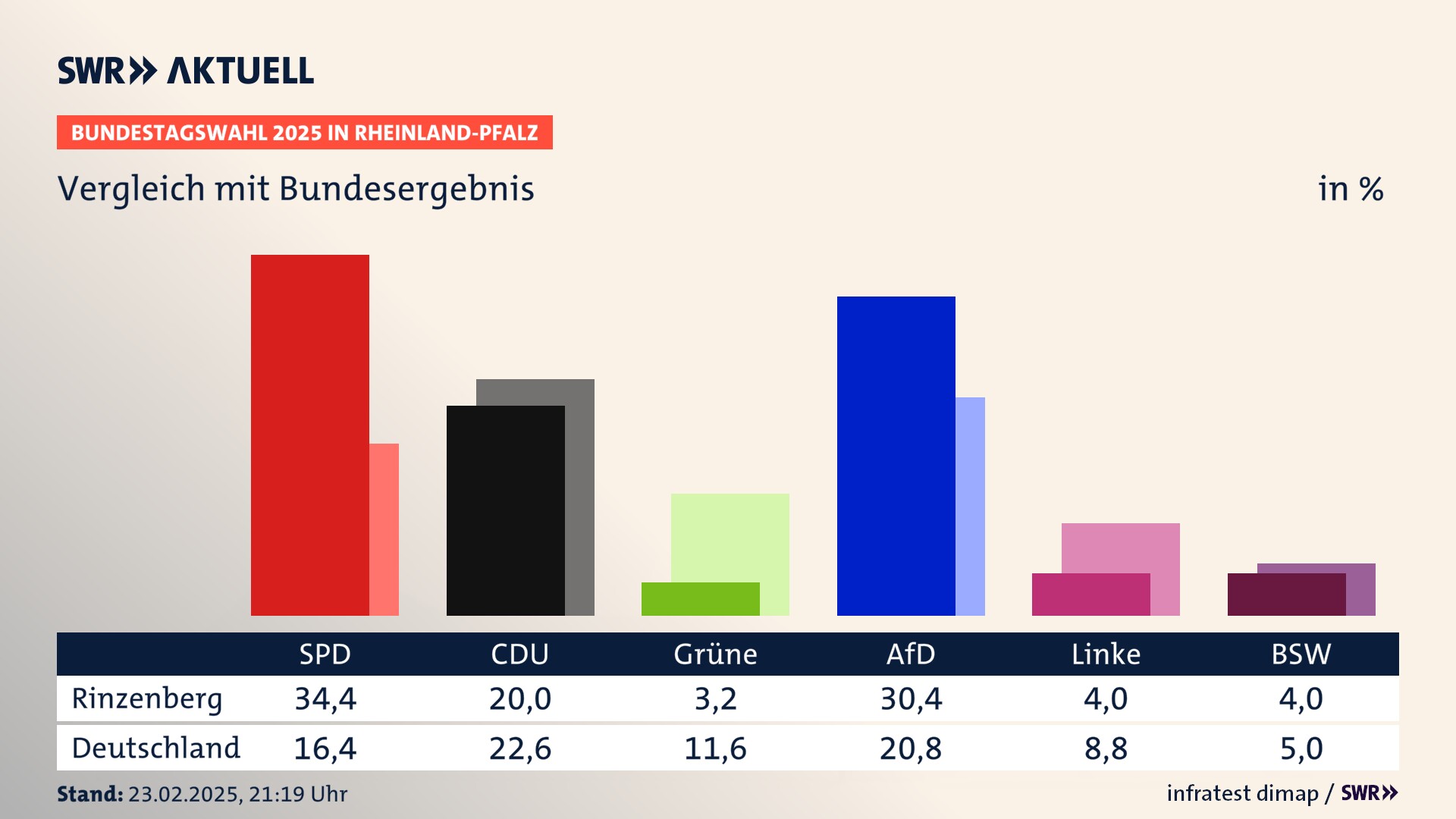 In Orten, die zu einer Verbandsgemeinde gehören, wird das Wahlergebnis in der Regel ohne Briefwähler angezeigt. Die Briefwahl wird zumeist zentral bei der Verbandsgemeinde ausgezählt und kann daher dann nicht separat für die einzelnen Gemeinden ermittelt werden. Das heißt, in den Ergebnissen der Ortsgemeinden sind nur die in den Wahllokalen abgegeben Urnen-Stimmen enthalten. Möglicherweise enthält dieses Gemeindeergebnis auch Stimmen aus Nachbargemeinden, wenn dort weniger als 30 Wählerinnen und Wähler ihre Stimme im Wahllokal abgegeben haben.