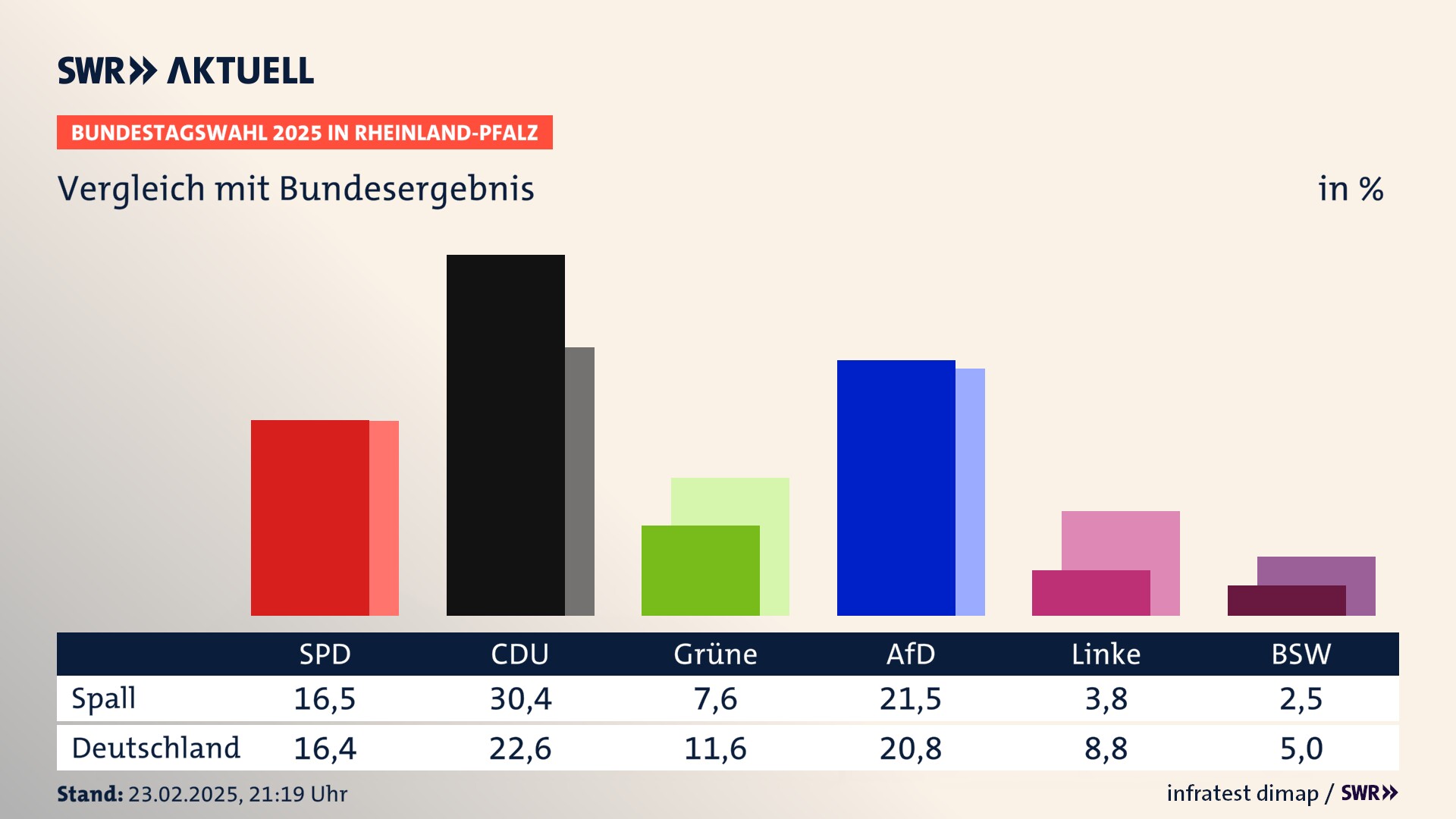 In Spall verliert die SPD leicht (-0,9 Prozentpunkte) und erzielt 16,5 Prozent der gültigen Stimmen. Die CDU erreicht 30,4 Prozent und gewinnt stark (+8,6 Prozentpunkte). Die Grünen erzielen 7,6 Prozent und verlieren stark (-8,3 Prozentpunkte). Die FDP verliert stark (-22,3 Prozentpunkte) und kommt auf 3,8 Prozent. Die AfD erreicht 21,5 Prozent und gewinnt stark (+14,3 Prozentpunkte). Die Linke erzielt 3,8 Prozent und gewinnt deutlich (+3,8 Prozentpunkte). Die Freien Wähler gewinnen deutlich (+3,6 Prozentpunkte) und kommen auf 5,1 Prozent. Die Tierschutzpartei erreicht 3,8 Prozent und gewinnt leicht (+2,3 Prozentpunkte).