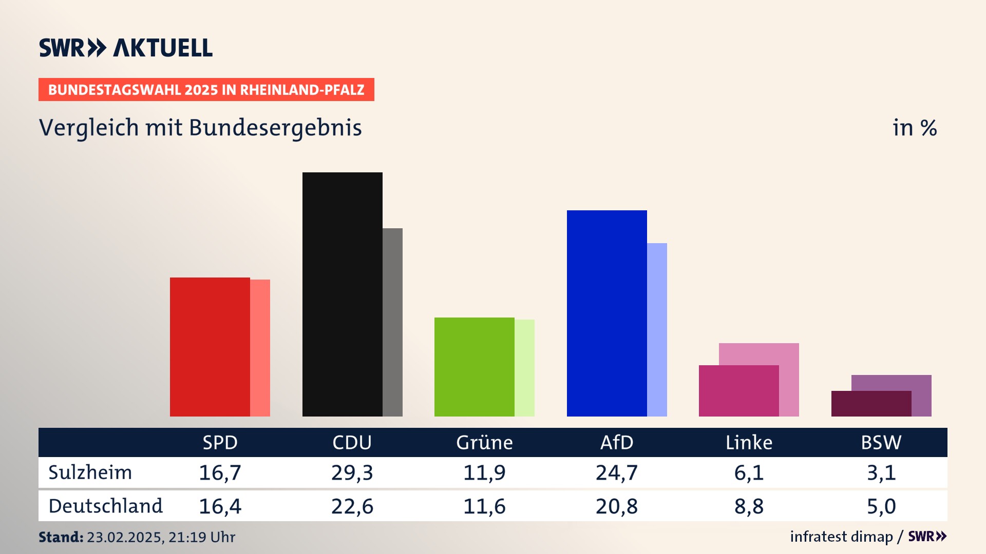 In Sulzheim verliert die SPD stark (-10,0 Prozentpunkte) und erzielt 16,7 Prozent der gültigen Stimmen. Die CDU erreicht 29,3 Prozent und gewinnt leicht (+2,9 Prozentpunkte). Die Grünen erzielen 11,9 Prozent und gewinnen leicht (+1,3 Prozentpunkte). Die FDP verliert stark (-10,2 Prozentpunkte) und kommt auf 4,2 Prozent. Die AfD erreicht 24,7 Prozent und gewinnt stark (+12,5 Prozentpunkte). Die Linke erzielt 6,1 Prozent und gewinnt deutlich (+4,7 Prozentpunkte). Die Partei Volt verliert leicht (-0,1 Prozentpunkte) und kommt auf 1,5 Prozent. Die 2021 nicht angetretene Partei BSW bekommt 3,1 Prozent.