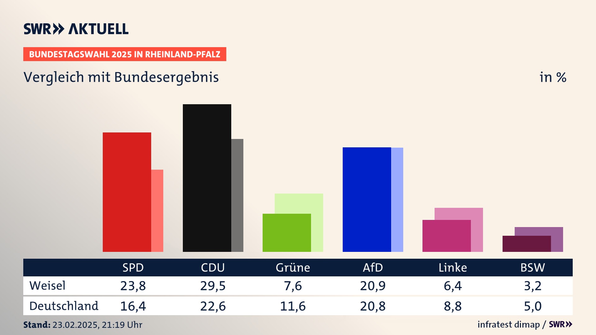 In Weisel verliert die SPD stark (-7,3 Prozentpunkte) und erzielt 23,8 Prozent der gültigen Stimmen. Die CDU erreicht 29,5 Prozent und gewinnt stark (+9,3 Prozentpunkte). Die Grünen erzielen 7,6 Prozent und verlieren leicht (-0,2 Prozentpunkte). Die FDP verliert stark (-8,9 Prozentpunkte) und kommt auf 4,2 Prozent. Die AfD erreicht 20,9 Prozent und gewinnt stark (+7,0 Prozentpunkte). Die Linke erzielt 6,4 Prozent und gewinnt leicht (+2,3 Prozentpunkte). Die Freien Wähler verlieren leicht (-2,8 Prozentpunkte) und kommen auf 1,7 Prozent. Die 2021 nicht angetretene Partei BSW bekommt 3,2 Prozent.