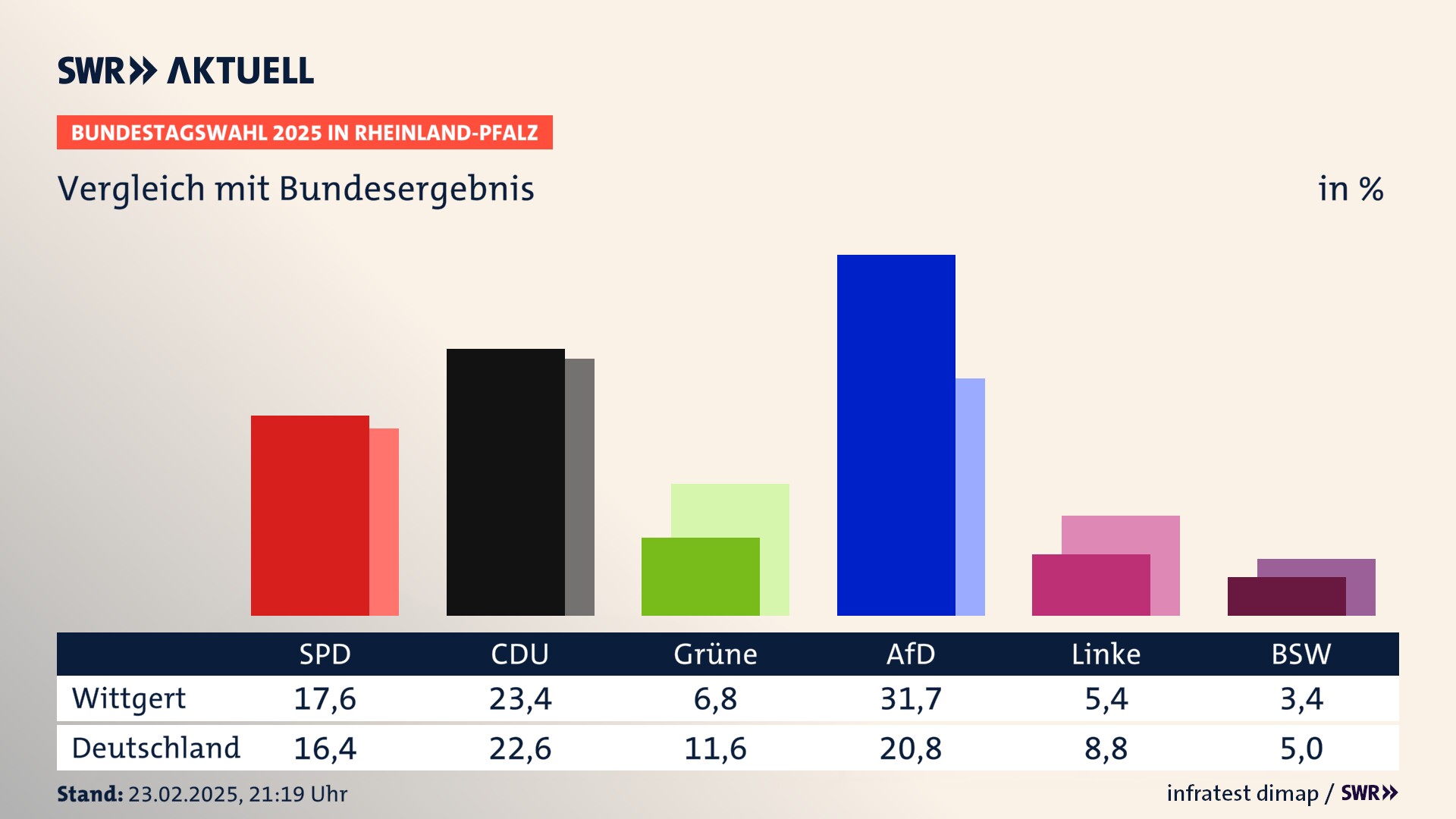 In Wittgert verliert die SPD stark (-5,8 Prozentpunkte) und erzielt 17,6 Prozent der gültigen Stimmen. Die CDU erreicht 23,4 Prozent und gewinnt leicht (+2,4 Prozentpunkte). Die Grünen erzielen 6,8 Prozent und verlieren leicht (-2,8 Prozentpunkte). Die FDP verliert stark (-9,3 Prozentpunkte) und kommt auf 6,8 Prozent. Die AfD erreicht 31,7 Prozent und gewinnt stark (+17,2 Prozentpunkte). Die Linke erzielt 5,4 Prozent und gewinnt leicht (+2,1 Prozentpunkte). Die Partei verliert leicht (-0,1 Prozentpunkte) und kommt auf 1,5 Prozent. Die 2021 nicht angetretene Partei BSW bekommt 3,4 Prozent.